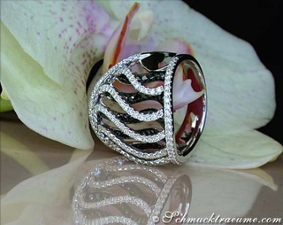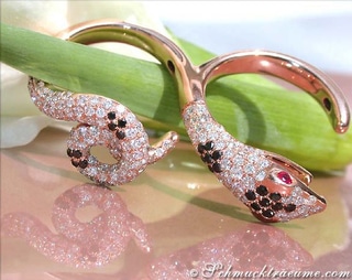 Zunächst ist dieser ungewöhnliche Ring in Form einer Schlange gearbeitet, die sich rund um den Finger windet und durchwegs mit schwarzen und weißen Diamanten besetzt ist. Dabei ist es der Kopf der Schlange, der den Ring vorrangig dominiert. Dieser ist detailgetreu modelliert, die Stirn ist komplett mit weißen Diamanten ausgefasst und auch die Augen wurden markant hervorgehoben.