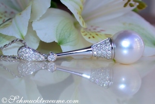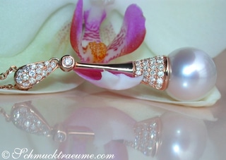 Darauf folgt nun je eine Südseezuchtperle – herrlicher Lüster, völlig makellos, perfekt gerundet, strahlend weiß.