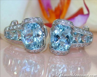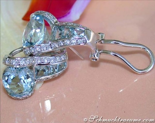 Nach oben hin befindet sich nun jeweils ein Aquamarintropfen, der in eine ebenso tropfenförmige Einfassung aus Diamanten gesetzt wurde.