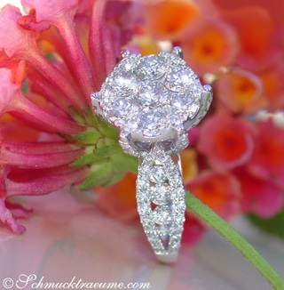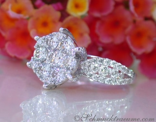 The stones are set closely and seamlessly next to each other. Viewed from a distance, one could almost think that it is not a matter of several diamonds, but a single large diamond solitaire** (illusion design)**.