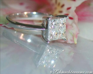 Four flawless princess-cut diamonds are set in the centre of each stud earring. All eight diamonds are set invisibly - there are no prongs inbetween (invisible setting).
