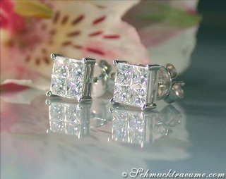 Four large diamonds (0.2275 ct. each) in immaculate princess cut are set in the centre of the ring head. All four diamonds are set next to each other almost invisibly, so no settings are visible (invisible setting). A highly elaborate setting work.