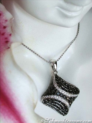 The entire ring head of this piece of jewellery is set with deep black shimmering diamonds and white diamonds in a highly attractive rhombic design.