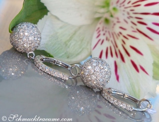The larger ball is completely set with deep black diamonds, the smaller one with white diamonds.
