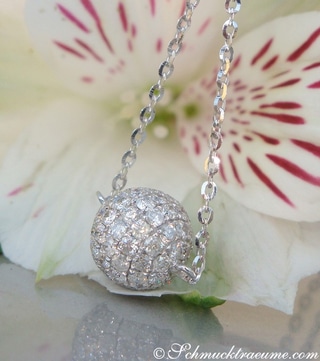Attractive finesse meets timeless elegance: An exquisite golden Southsea pearl is accompanied in this pendant by sparkling diamonds, and this in an extremely unusual way. A shimmering diamond pavé ball, which rotates on its own axis, lends this wonderful pendant additional charm. A jewel to fall in love with!