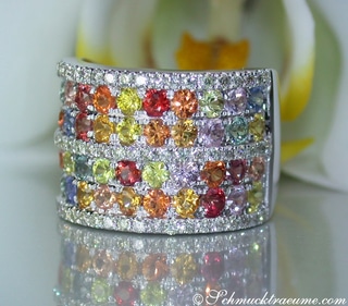 Across the entire width of the ring head, 24 beautifully clear sapphires in princess cut with a strong midnight blue shimmer and 36 brilliant-cut diamonds are set in alternation.