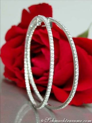 These magnificent hoop earrings are set with large diamonds on the front and also on the inner back. This creates a dreamlike sparkle and flash - from all sides, with every movement.