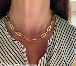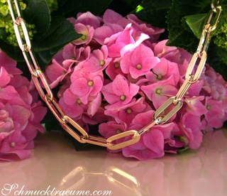 Zunächst ist dieses Weitanker Collier – auch als „Paper Clip“ Design bekannt – in halbmassiver Ausführung in Gelbgold 585 gearbeitet. Extra lang gezogene, oval abgerundete Glieder sorgen hier für klare Linien und minimalistischen Chic.