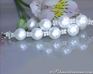 Miteinander verbunden sind die Perlen durch solide Doppel-Weißgoldschienen, die mit Brillanten besetzt sind.