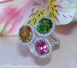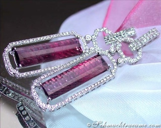 Auch diese vier Kreise sind außen mit Brillanten ausgefasst. In die Mitte wurden jeweils völlig klare, kräftig pink schimmernde sowie rund facettierte Tourmaline gesetzt.