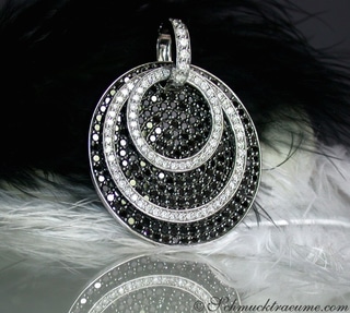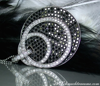 A large round white gold plate, which is completely paved with diamonds shimmering in deep black, and two circles of different sizes - now paved with white diamonds - are suspended in this baile.
