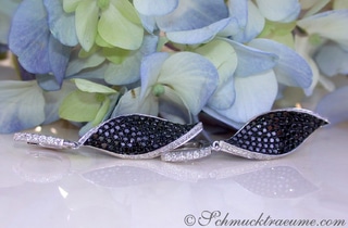 First, the ring head is crafted in the form a long, slightly curved leaf. This leaf is set with black diamonds entirely. The edges of the leaf are moreover set with white brilliant cut diamonds.