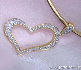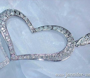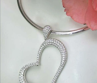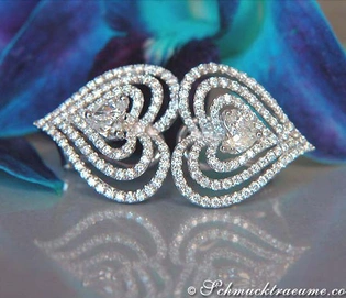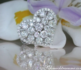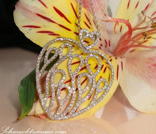Zunächst ist dieser ungewöhnliche Anhänger in Form eines leicht gewölbten (also nicht gänzlich flachen) Herzens gearbeitet, das in Weißgold gefertigt ist. Die beiden Außenseiten sind mit Brillanten ausgefasst, dazwischen sind wiederum Diamanten im Trapezschliff nahtlos aneinander gesetzt.