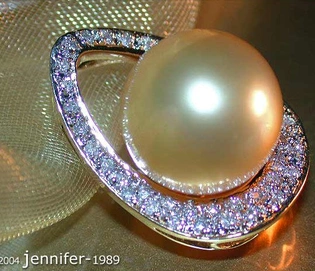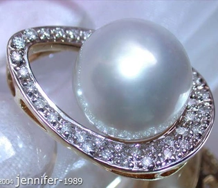 Eine prächtig große, völlig makellose weiße Südseeperle (perfekt gerundet mit seidig glatter Haut und bestem Hochglanzlüster) ist in eine komplett mit Brillanten ausgefasste, geschwungene Schiene gesetzt. Diese oval geschwungene Schiene ist im unteren Bereich, in welchem die Perle gesetzt ist, etwas breiter und verläuft nach oben hin etwas schmaler.