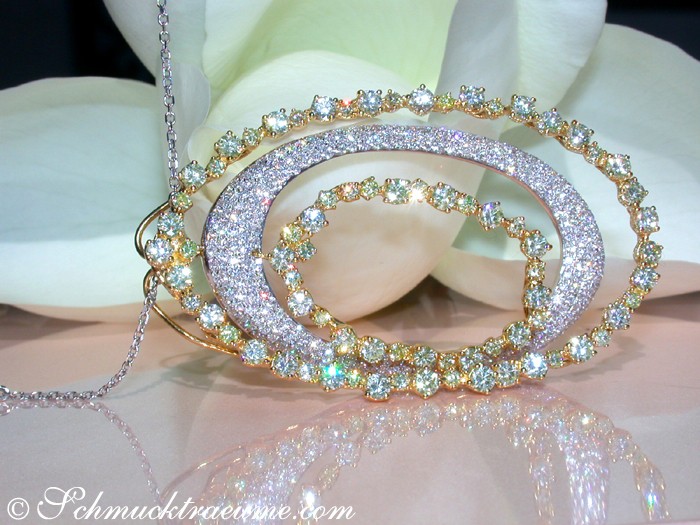 Zunächst ist aussen ein große Oval in Gelbgold-750/000 gefertigt, in welches 50 feinste zitronengelbe Brillanten gesetzt sind. Daran hängt innen ein Weissgold-750/000 Oval: dieses nun mit 294 Brillanten absolut ebenmäßig ausgefasst.