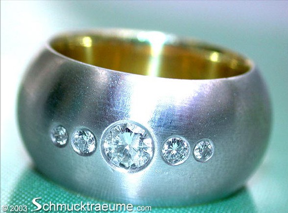 In die Mitte des extrem breiten sowie vollmassiv gefertigten Rings wurden fünf Brillanten (Durchmesser des mittigen Brillanten: 4mm, nach außen kleiner werdend) gesetzt, die in Farbe und Reinheit sehr gute Qualität aufweisen.