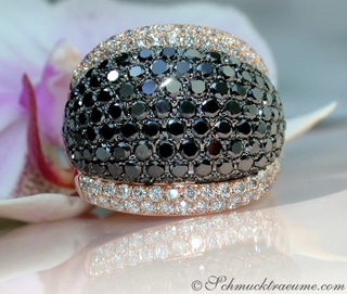 Zunächst ist der durchaus breite Ringkopf komplett mit Brillanten im Micropavé-Setting ausgefasst. Das heißt: Es sind keinerlei Fassungen vorhanden, die Oberfläche ist völlig glatt und ebenmäßig.