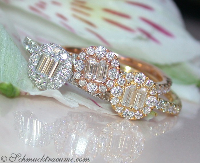 Zunächst ist jeder einzelne Ringkopf mit zwei Diamanten im Baguette Schliff ausgefasst, die wiederum von Brillanten umrahmt werden. Auch die Ringschienen sind bis gut in die Mitte hinein mit Brillanten ausgefasst.