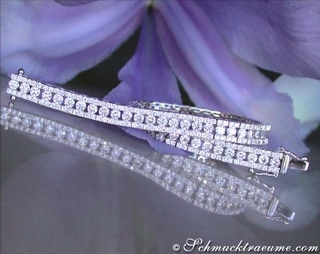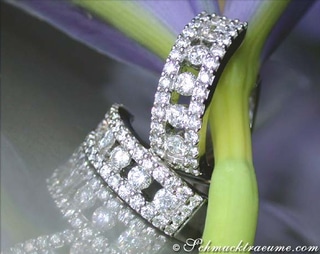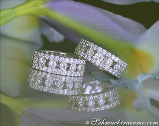Die grösseren Diamanten sind zwischen die Diamantenschienen gespannt, also erneut eine aufwändige Fasserarbeit. Alle Diamanten sind bis weit in die seitliche Ringschiene gesetzt. Insofern sehen Sie beim Tragen nur Brillanten.