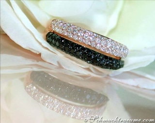Über die gesamte Länge beider Ohrstecker sind jeweils zwei Roségold-Schienen gesetzt, die mit weißen Brillanten und tiefschwarz schimmernden Diamanten ausgefasst sind.