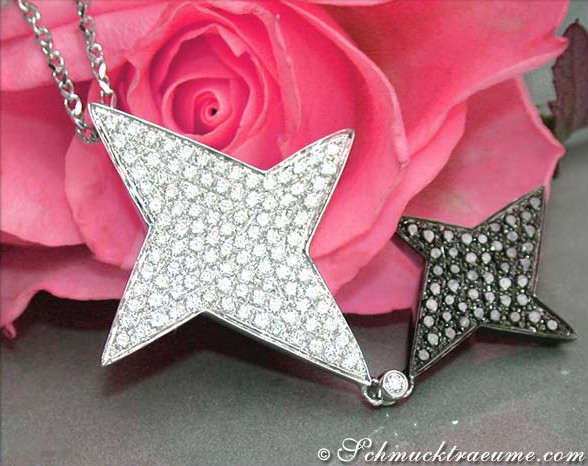 Darunter, durch einen Brillant in Zargenfassung verbunden, hängt nun ein weiterer massiver Stern. Dieser ist ein wenig kleiner und mit 46 tiefschwarz schimmernden Diamanten ausgefasst.