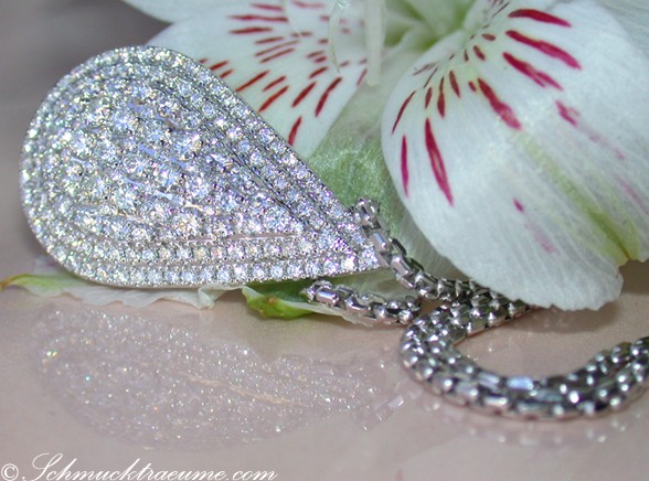 Dieser Tropfen ist mittig mit 26 feinsten Brillanten (1,15 cts. TW-VS1) ausgefasst. Etwas tiefer sind weitere 113 Brillanten (0,68 cts. TW-VS1) als doppel-reihige äussere Einfassung gesetzt.