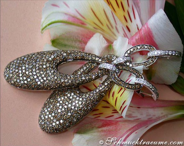 Verbunden durch Zwischenglieder, die nun mit weißen Brillanten ausgefasst sind, hängen darunter zwei vollmassive, extra-lange oval- bzw. tropfenförmige Glieder. Diesen sind komplett mit feinsten naturbraunen Brillanten ausgefasst.