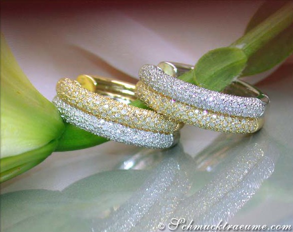 Die gesamten Vorder- sowie die Außenseiten der Creolen sind komplett mit Diamanten, gefasst in Gelb- und Weißgold, besetzt.