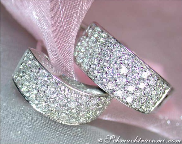 Die Vorderseiten dieser relativ breiten Creolen sind komplett mit Brillanten sehr guter Qualität in Farbe und Reinheit ausgefasst. Die rückwärtigen Seiten sind in hochglanzpoliertem, massiven Weißgold gearbeitet.