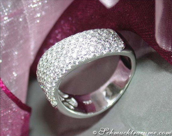 Der gesamte, leicht geschwungene Ringkopf ist komplett mit Brillanten ausgefasst, die im sogenannten Micropavé Setting gesetzt sind. Das heißt: Jeder einzelne Brillant ist exakt gleich geschliffen. Zudem sind keinerlei Fassungen ersichtlich, die Oberfläche ist vollkommen glatt und seidig. Eine höchst aufwendige Schliff- und Fasserarbeit.
