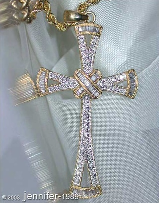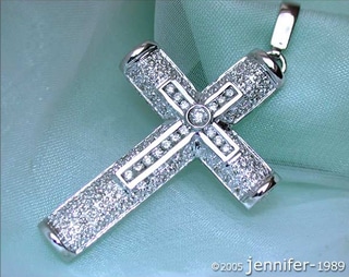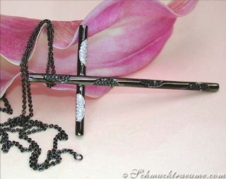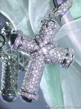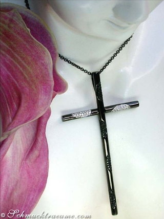 In der Mitte des Kreuzes kreuzt sich wiederum ein Kreuz, das ebenso mit Diamanten im Baguette-Schliff ausgefasst ist.