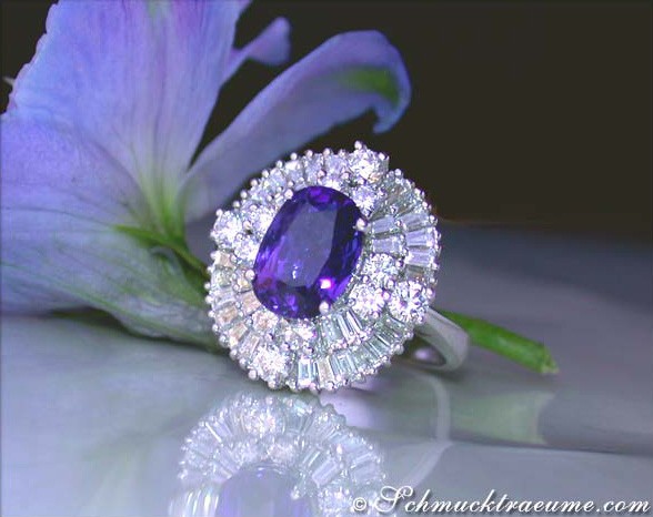 Mit diesem exklusiven Ring - besetzt mit einem exquisiten Saphir und von Vollschliff-Brillanten sowie Trapez-Diamanten begleitet - ist unseren Goldschmieden ein prachtvolles Juwel vom Allerfeinsten gelungen. Ein Schmuckstück der Nobelklasse, das auch hohen Ansprüchen mühelos gerecht wird!