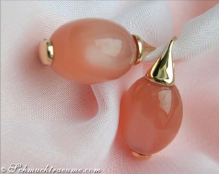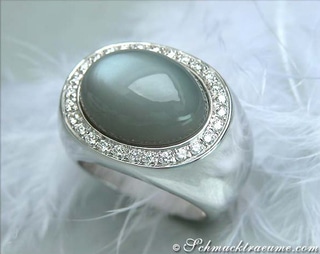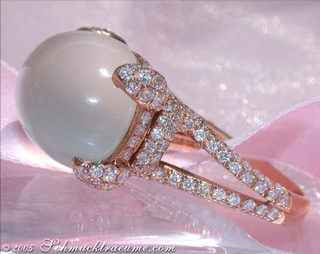 In die Mitte des Ringkopfs ist ein großer, lachsfarbig schimmernder Mondstein-Cabouchon gesetzt - allerfeinste Qualität, makelloser Schliff, je nach Lichteinfall ein wundervolles Farbenspiel.