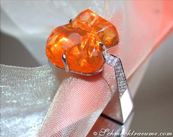 Der Opal ist unten zusätzlich in eine angepasste, massive Weißgoldschale eingebettet. Das heißt: Das Weißgold schimmert durch den Opal hindurch, wodurch die orangene Farbe noch intensiver leuchtet.