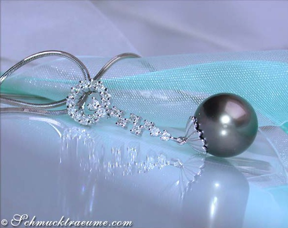Grazile Formen und stattliche Perlenqualität vereinen sich in diesem wundervollen Tahitiperle Anhänger zu einem Schmuckstück, das durch zeitlose Eleganz und femininen Charme besticht.