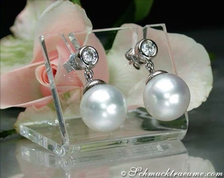 In schlichte Gelbgoldfassungen sind zwei große Südseperlen gesetzt - nahezu bis völlig makellos, perfekt gerundet, strahlend weiß, seidigst glatte Haut, absolut perfekter Hochglanzlüster.