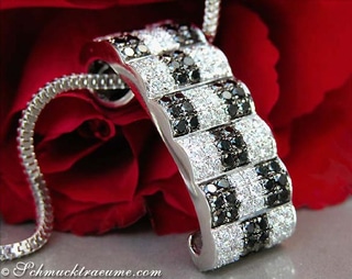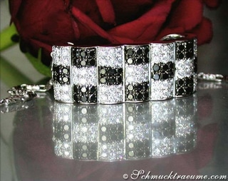 Der gesamte Ring - vollmassiv in Weißgold gefertigt - ist rundum mit hervorragenden schwarzen Diamanten und weißen Brillanten im Schachbrett-Design ausgefasst, wobei die einzelnen Carrés leicht gewellt sind.