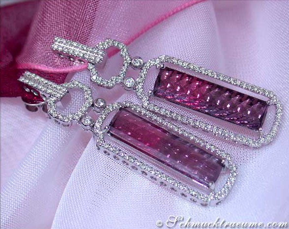 Zwei vollkommen klare, herrlich geschliffene / facettierte pink Tourmaline von intensivster Farbbrillanz sind zunächst in massive Weißgold-Schienen gesetzt.