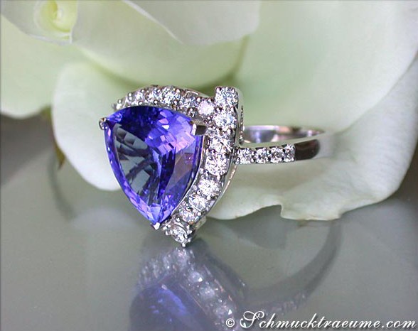 Klassische Eleganz trifft auf prächtige Edelsteinqualität: Dieser fabelhafte AAA Tansanit Ring mit Brillanten überzeugt vor allem Damen, zeitlose Juwelen bevorzugen und exzellente Qualität in Farbintensität und Brillanz zu schätzen wissen.