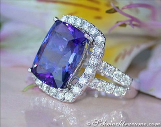 Umrahmt wird dieser Tansanit von feinsten Brillanten. Ebenso sind auch die beiderseitig 3-fachen Ringschienen mit Brillanten ausgefasst, wobei sich diese wiederum zu einer massiven Weißgold-Schiene verjüngen. Total: 71 Brillanten, 0,80 cts. TW-VS.