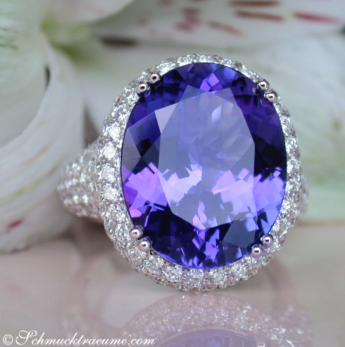 Umrahmt wird der Tansanit doppelreihig von feinsten Brillanten. Auch die Ringschiene ist beidseitig bis gut in die Mitte mit Brillanten ausgefasst.