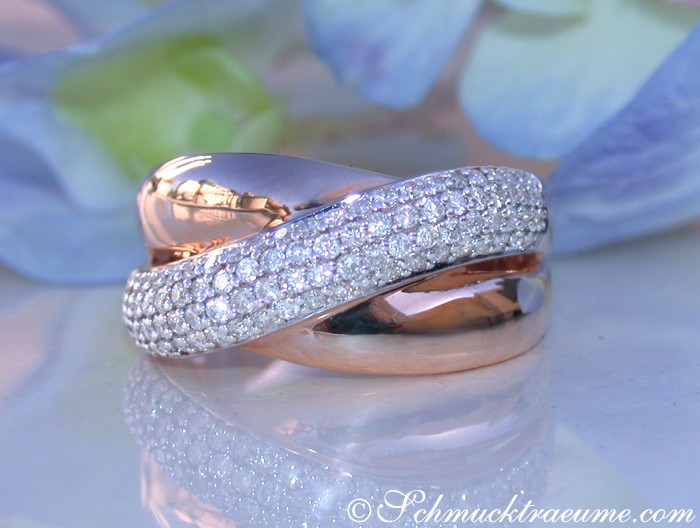 Zunächst ziehen sich zwei hochglanzpolierte Roségold-Schienen über den Ringkopf (10 mm breit), die bis hinein in die seitlichen Ringschienen reichen. Darüber schwingt sich nun eine zweite Schiene, die vollständig mit Diamanten ausgefasst ist.