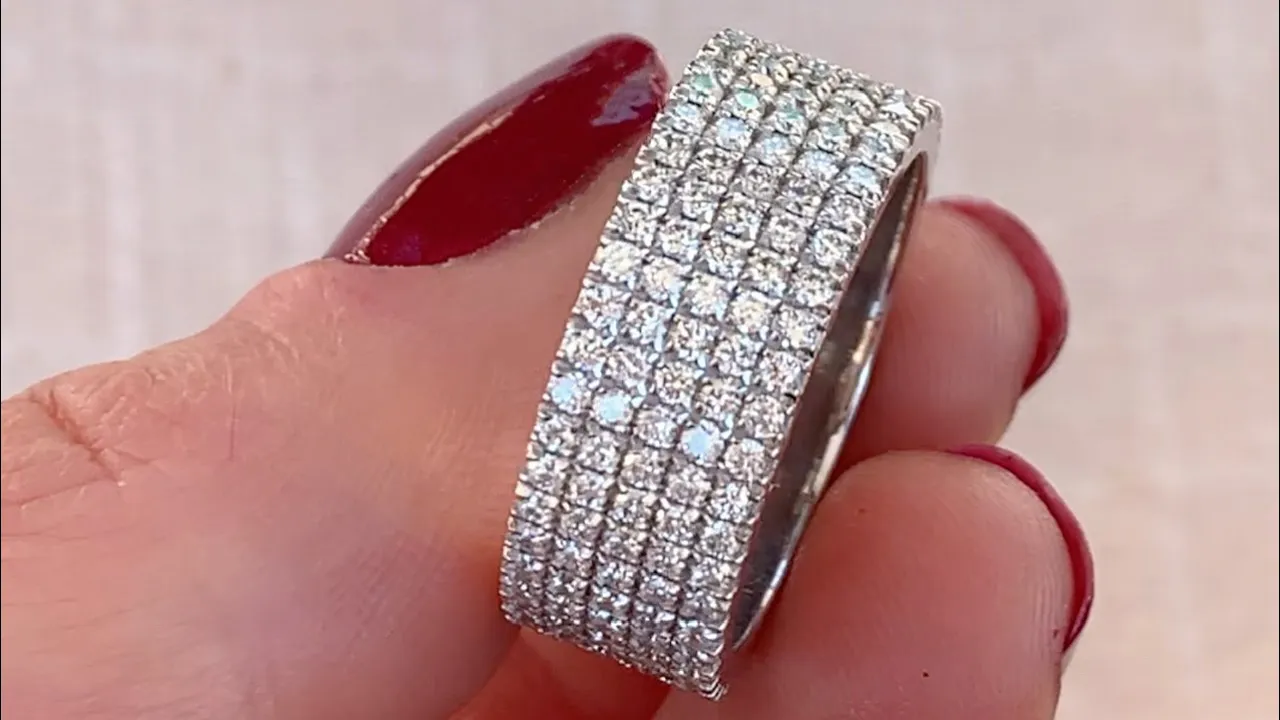 Zunächst ist der gesamte Ring rundum mit Brillanten ausgefasst. Alle Steine sind akkurat in fünf Reihen gesetzt. Die Oberfläche ist dank des Micropavé-Settings völlig glatt und frei von scharfen Stellen. Qualität, die man sieht und fühlt.