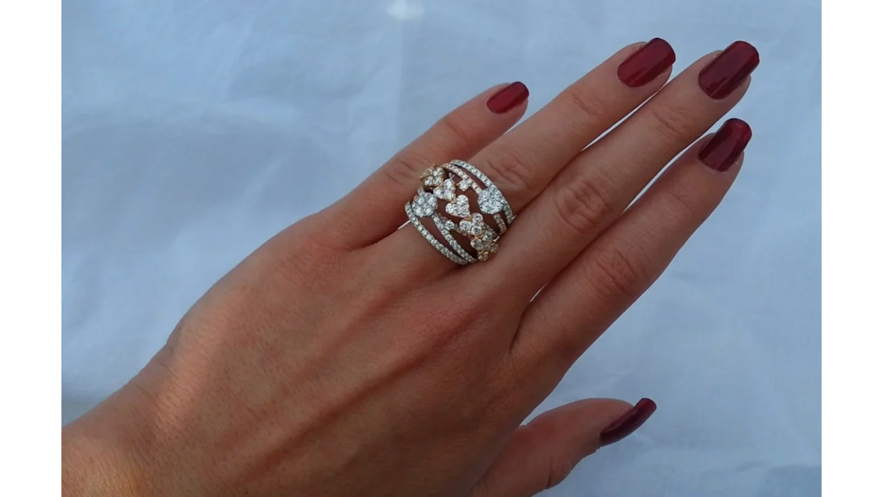 Über den gesamten Ringkopf verlaufen sechs Schienen (in Rosé- und Weissgold-750 gefertigt), die komplett mit Brillanten ausgefasst sind. Die beiden äusseren Schienen sind durchwegs mit Brillanten ausgefasst. Darauf folgen zwei weitere Brillantenschienen, auf welchen etwas erhöht zwei runde Fassungen gesetzt sind, die jeweils mit vier grösseren und fünf kleineren, eng aneinander gesetzten Brillanten ausgefasst sind.