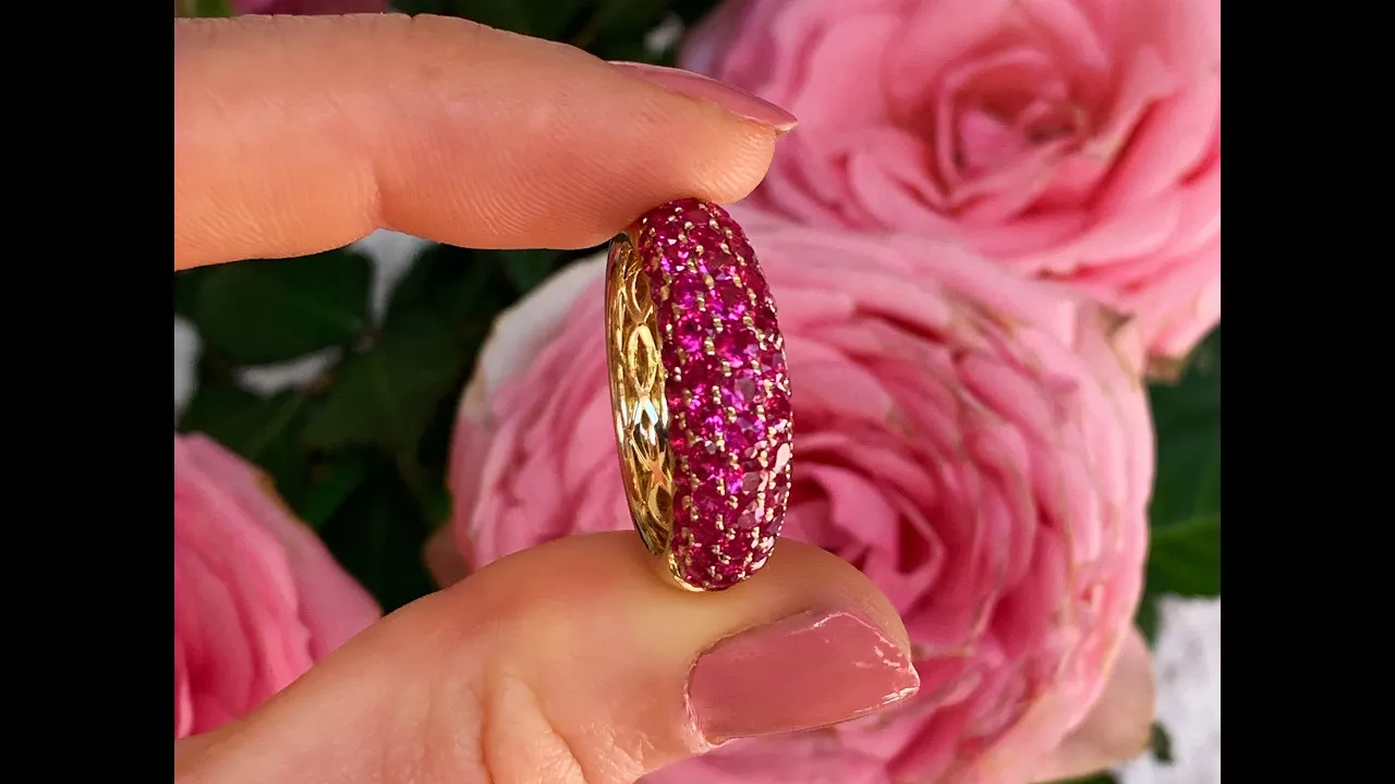 Der gesamte Ringkopf ist in fünf Reihen mit allerfeinsten pink-roten Rubinen (makelloser Schliff, sehr gute Reinheit) ausgefasst.