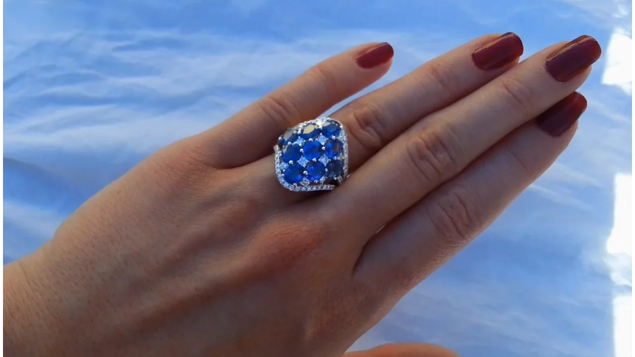 Zunächst wird der Ringkopf von neun oval facettieren, absolut transparenten und intensiv kornblumenblauen Ceylon Saphiren dominiert. Dazwischen sind, sozusagen als Akzente, einzelne größere Brillanten gesetzt. Alle Steine sind ebenmäßig gesetzt und ergeben so in der Summe ein interessantes, gleichmäßiges Muster.
