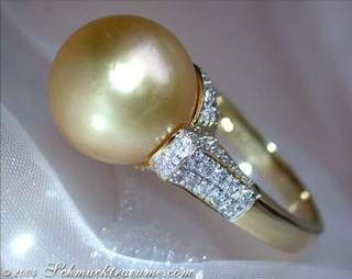 The pearl is furthermore set into a setting that resembles a collar which is set with diamonds. Also the ring shank is set with diamonds until its middle part.