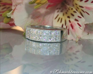 Seven rows of 64 flawless princess-cut diamonds are set across the entire ring head. All stones are set invisibly, meaning that there are not prongs between the stones. The surface feels completely smooth, there are no unevenness or sharp spots.