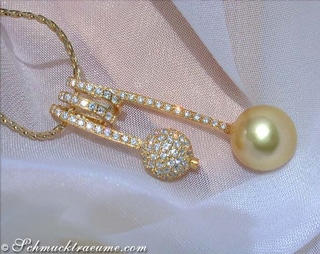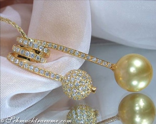 A large South Sea pearl is set in the middle of this magnificent pendant: completely round, extremely rare, deep golden colour, best high gloss lustre and completely flawless, i.e. no growth characteristics whatsoever. The pearl is set movable, so that it turns around its own axis.