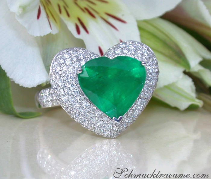 With this terrific emerald heart ring we present a top class jewel that impresses by finest craftsmanship, excellent gemstone quality and timeless, feminine elegance.